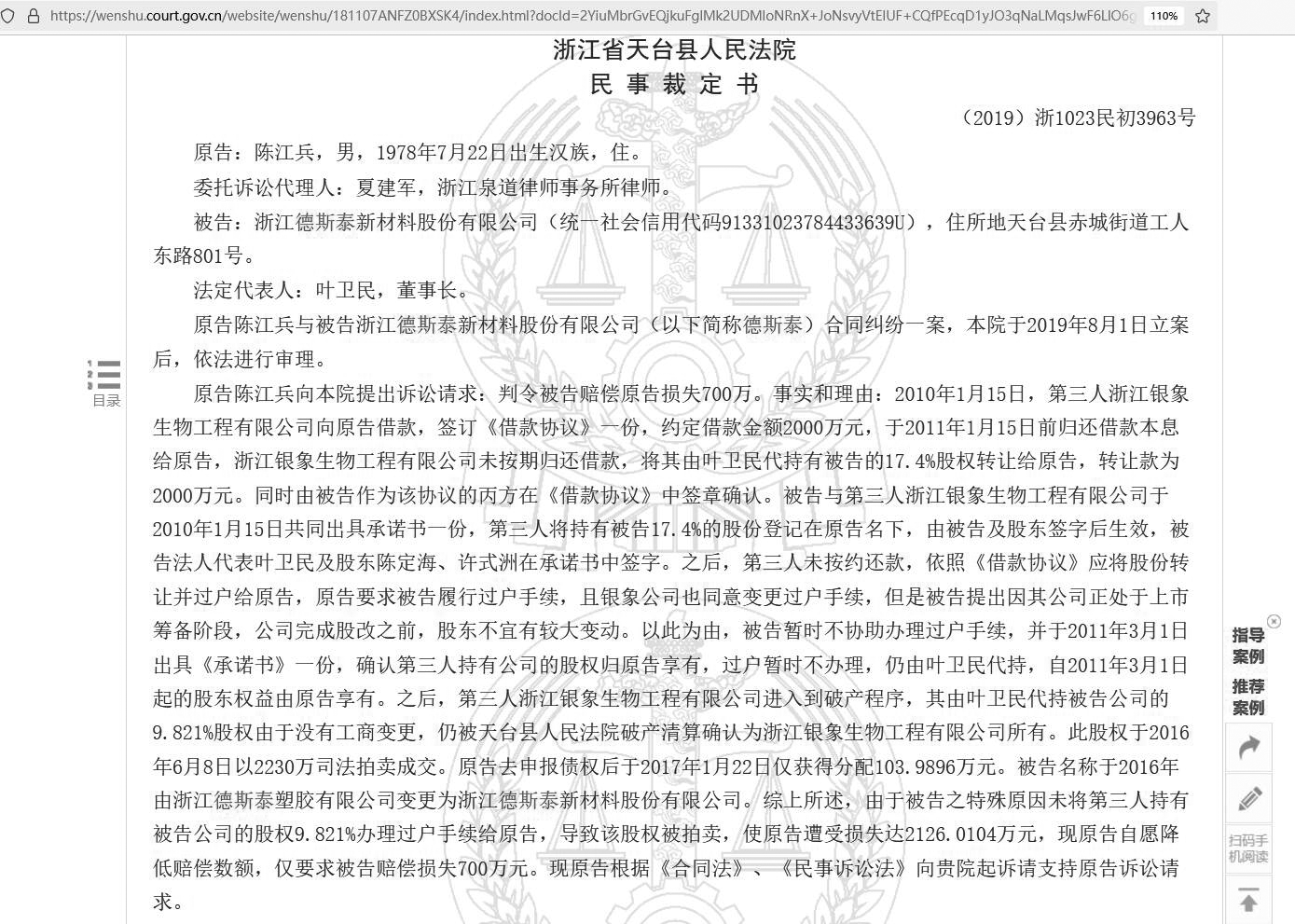 陳江兵與浙江德斯泰新材料股份有限公司合同糾紛一審民事裁定書部分截圖