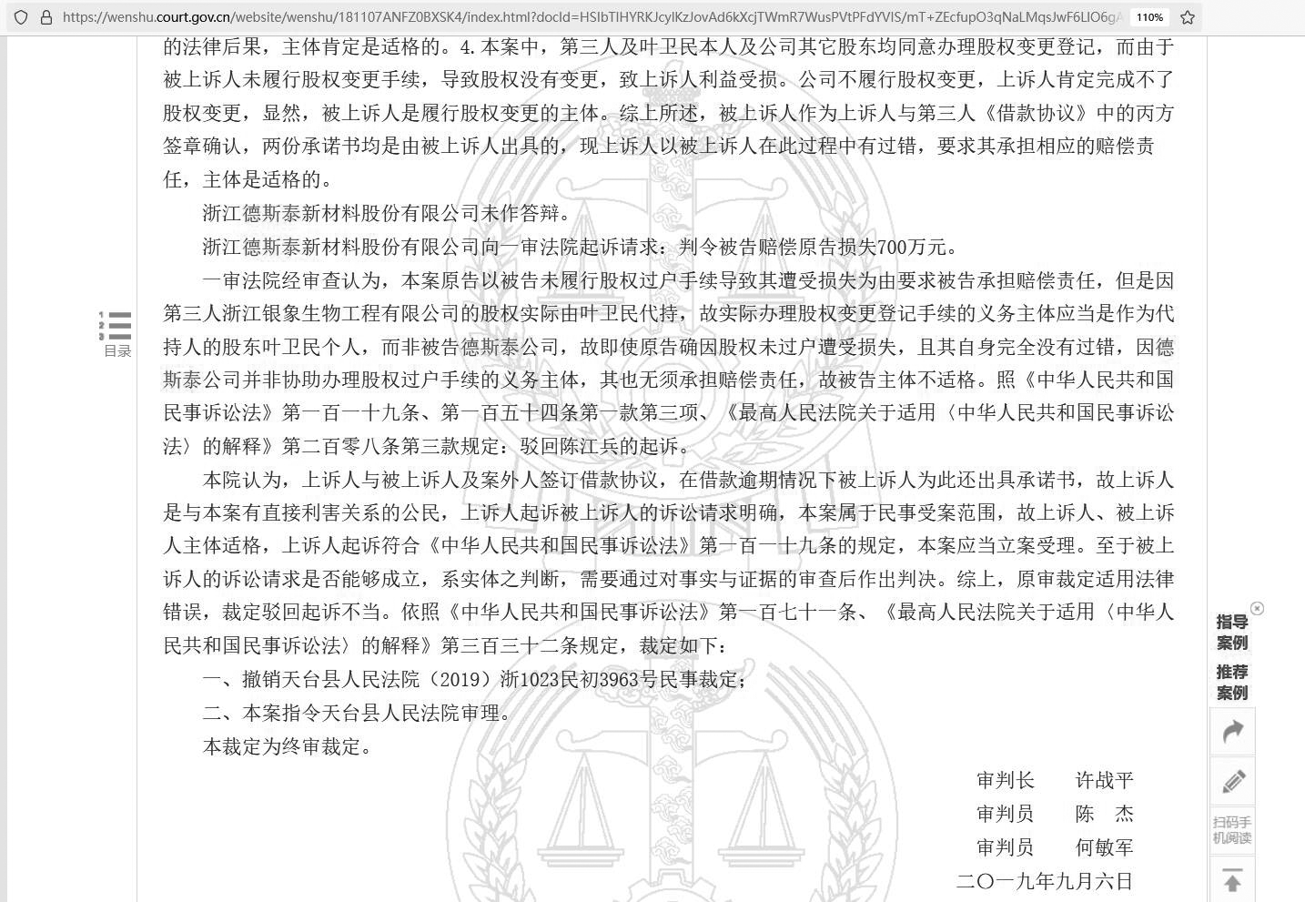 2019年10月15日發布的《陳江兵、浙江德斯泰新材料股份有限公司合同糾紛二審民事裁定書》顯示,“上訴人、被上訴人主體適格,上訴人起訴符合《中華人民共和國民事訴訟法》第一百一十九條的規定,本案應當立案受理。至于被上訴人的訴訟請求是否能夠成立,系實體之判斷,需要通過對事實與證據的審查后作出判決。綜上,原審裁定適用法律錯誤,裁定駁回起訴不當……裁定如下:一、撤銷天臺縣人民法院(2019)浙1023民初3963號民事裁定;二、本案指令天臺縣人民法院審理。本裁定為終審裁定。”