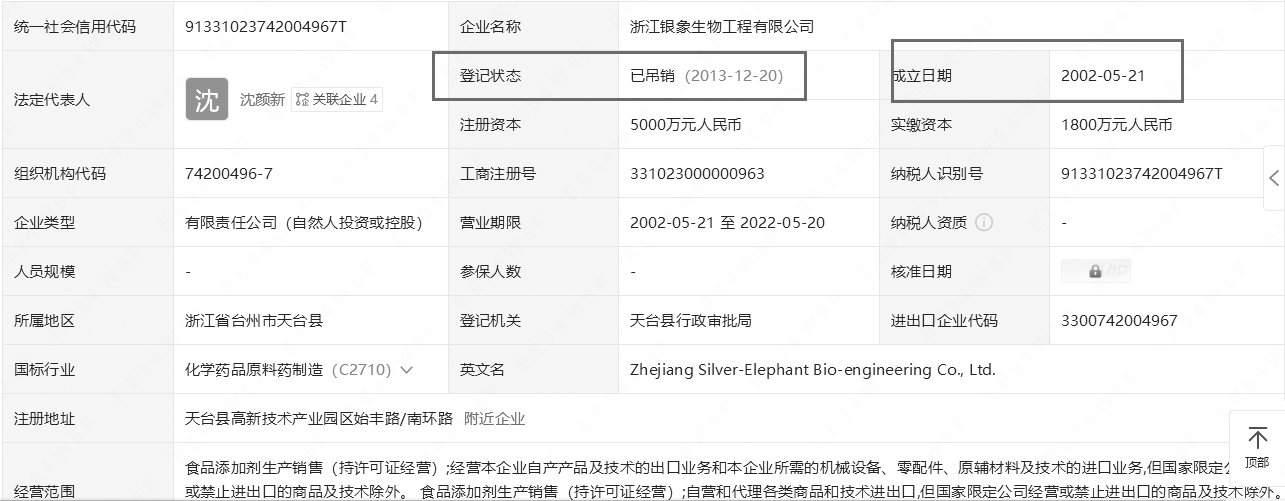 通過企查查查詢到的工商信息顯示,浙江銀象成立的日期比招股書信披日期早了7年多。浙江銀象成立于2002年5月21日,法定代表人為沈顏新,注冊資本為5000萬元,企業地址位于天臺縣高新技術產業園區始豐路/南環路,所屬行業為醫藥制造業。該企業經營范圍包含:食品添加劑生產銷售(持許可證經營);經營本企業自產產品及技術的出口業務和本企業所需的機械設備、零配件、原輔材料及技術的進口業務,但國家限定公司經營或禁止進出口的商品及技術除外。食品添加劑生產銷售(持許可證經營);自營和代理各類商品和技術進出口,但國家限定公司經營或禁止進出口的商品及技術除外。