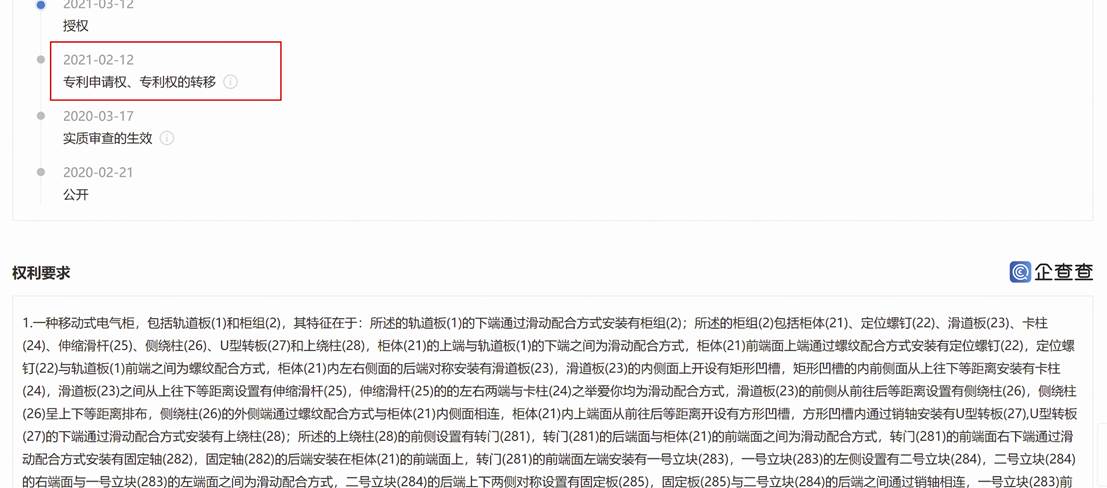 一種移動式電氣柜專利轉(zhuǎn)移情況企查查截圖