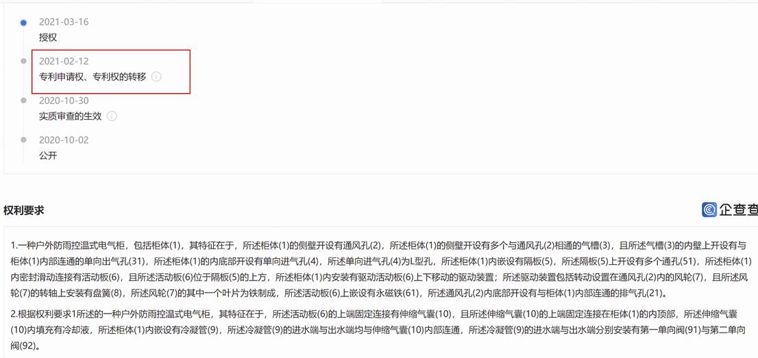 一種戶外防雨控溫室電氣柜專利轉(zhuǎn)移情況企查查截圖
