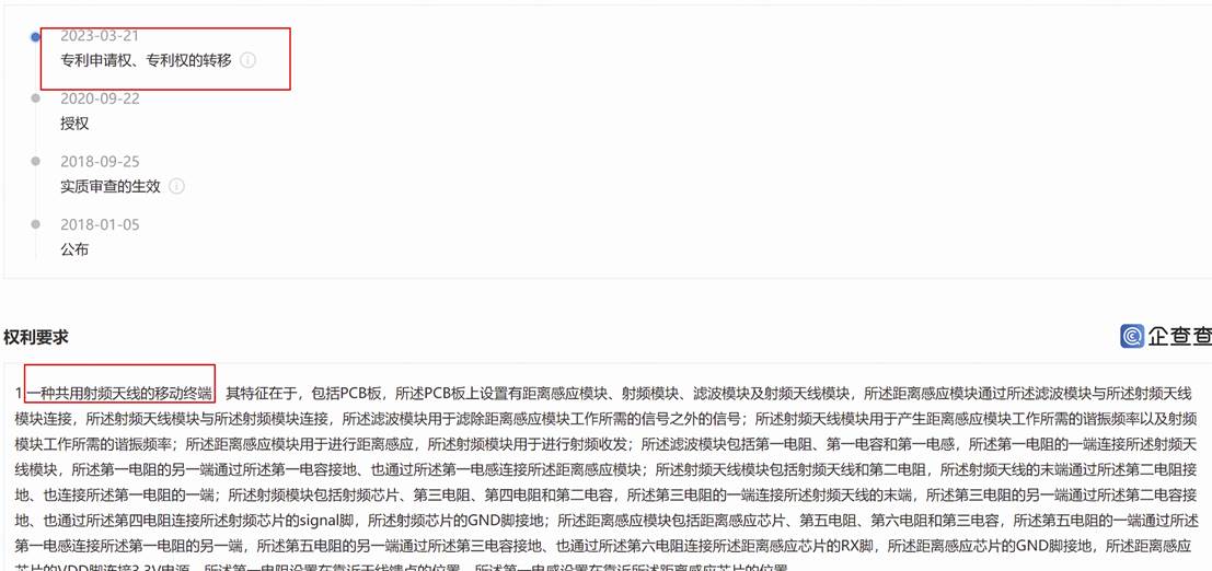 一種共用射頻天線的移動終端專利轉(zhuǎn)移情況企查查截圖