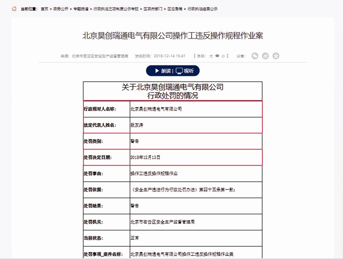 還值得一提的是,記者向公司發(fā)出采訪函后又另有發(fā)現(xiàn)——北京市密云區(qū)安全生產監(jiān)督管理局在2018年12月13日對北京昊創(chuàng)瑞通電氣有限公司(納眾杰曾用名)開具了一張?zhí)幜P單,該處罰單顯示該企業(yè)法定代表人仍為段友濤。事實上,2018年12月13日已是公司回復函中披露納眾杰完成0元轉讓的兩個多月之后。