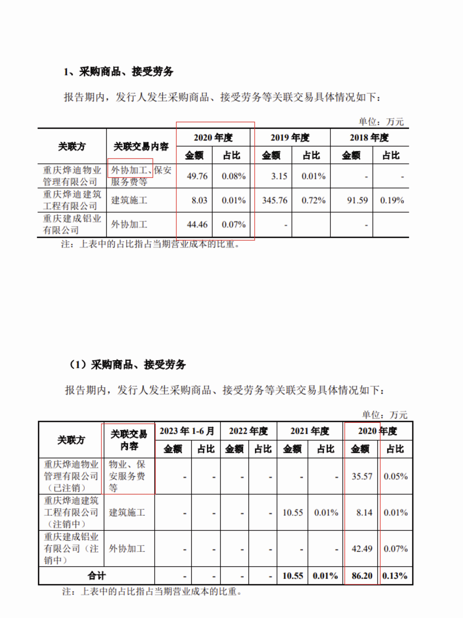 還有2021年版招股書顯示,與重慶燁迪物業管理有限公司關聯交易內容竟然還包括外協加工,而2023年版招股書相關關聯交易內容中則剔除了“外協加工”。
