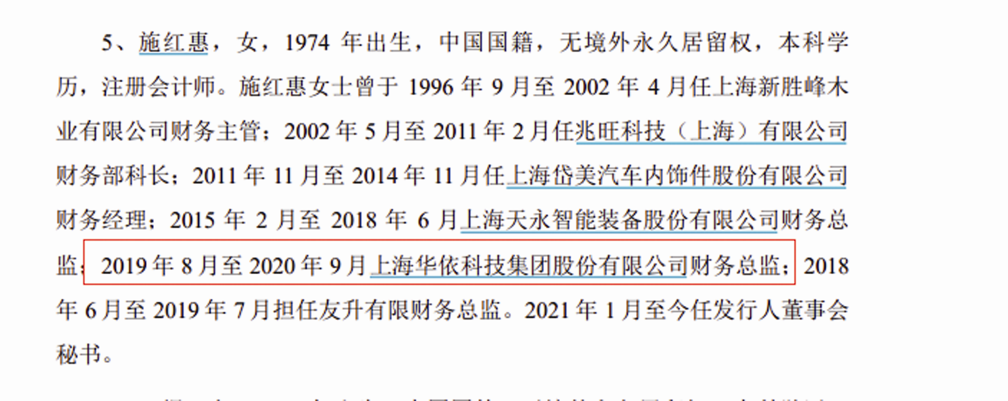 友升股份招股書披露施紅惠的具體履職經歷顯示: 施紅惠曾于1996年9月至2002年4月任上海新勝峰木業有限公司財務主管;2002年5月至2011年2月任兆旺科技(上海)有限公司財務部科長;2011年11月至2014年11月任上海岱美汽車內飾件股份有限公司財務經理;2015年2月至2018年6月任上海天永智能裝備股份有限公司(以下簡稱“天永智能”)財務總監;2019年8月至2020年9月任上海華依科技集團股份有限公司(以下簡稱“華依科技”)財務總監;2018年6月至2019年7月任友升有限財務總監。2021年1月至今任公司董秘。