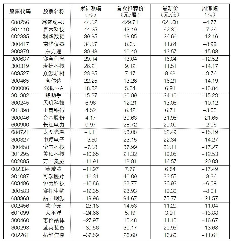 30成份股本周全部下跌,跌幅相對較小的是長江電力、工商銀行、寒武紀;跌幅較大的有臺基股份、晶豐明源、萬豐奧威、英威騰、全志科技、惠倫晶體。