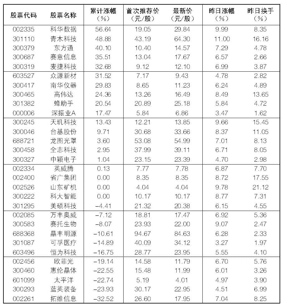 本報訊(記者 湯曉飛)周二,受到利好消息刺激,大盤放量反彈,家電零部件、電機制造、電子商務等板塊領(lǐng)漲,飲料、貴金屬等板塊走勢較弱。昨日,上證綜指上漲80.18點,漲幅為2.54%;深證成指上漲368.99點,漲幅為3.77%;大眾30指數(shù)上漲0.37%。30成份股昨日漲幅前五位的是青木科技、科華數(shù)據(jù)、天璣科技、賽托生物、高偉達,漲幅分別為11%、9.99%、9.66%、9.07%、8.49%;跌幅方面,寒武紀-U下跌3.48%。
