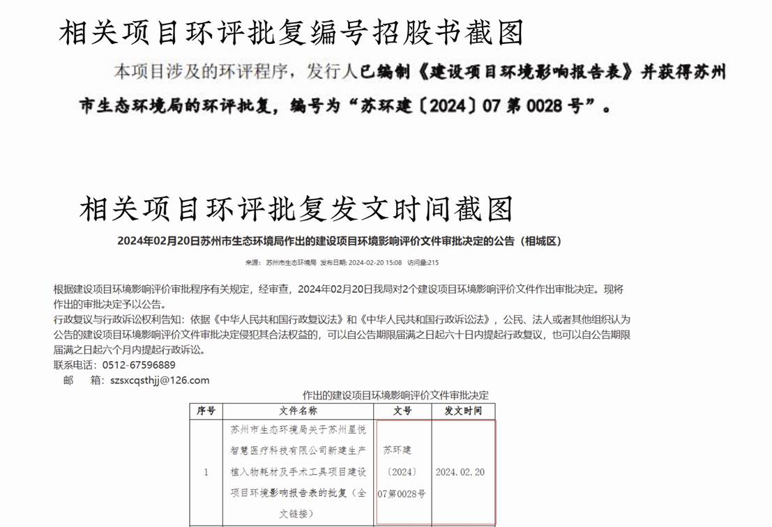 記者查詢蘇州市生態(tài)環(huán)境保護(hù)局網(wǎng)站發(fā)現(xiàn),該網(wǎng)站2024年2月20日曾披露“蘇州市生態(tài)環(huán)境局作出的建設(shè)項(xiàng)目環(huán)境影響評(píng)價(jià)文件審批決定的公告(相城區(qū))”,上述公告顯示“蘇州星悅智慧醫(yī)療科技有限公司新建生產(chǎn)植入物耗材及手術(shù)工具項(xiàng)目”的環(huán)評(píng)批復(fù)編號(hào)正是“蘇環(huán)建〔2024〕07第0028號(hào)”。