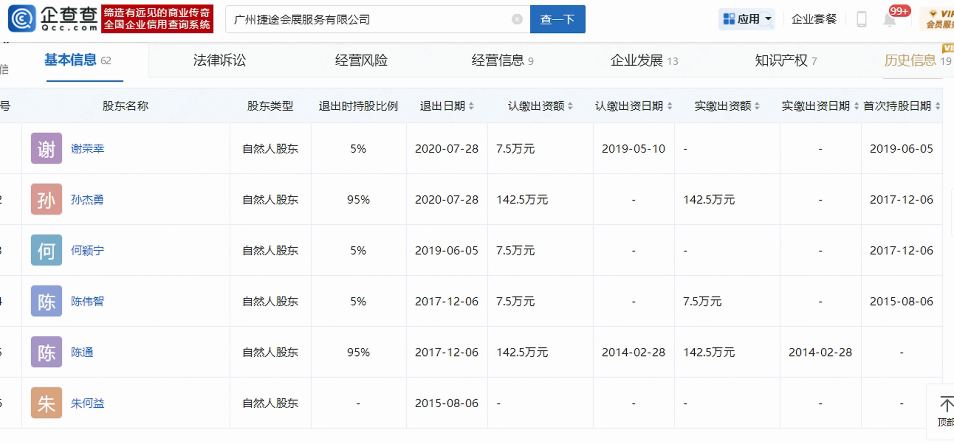 通過企查查查詢到的工商登記信息顯示,捷途會展工商登記的股東、歷史股東中并無伍俊雄、陳培鋼。2020年7月退出的股東分別為謝榮幸、孫杰勇,分別持股5%和95%。孫杰勇曾持有捷途會展95%股份,恰好在2020年7月退出,一同退出的還有持股5%的謝榮幸。