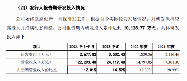 天星醫療強調,其所屬的醫療器械行業,屬于技術創新和高研發投入行業,公司需持續豐富產品管線并對于現有產品進行優化升級,以保持在行業競爭中的優勢,而且其自稱具有“強大的自主創新研發能力,多項核心技術實現產品轉化”。按理說,這樣的一家企業,對研發投入應該是出手闊綽、毫不吝嗇的,報告期內公司研發費用及其營收占比應具有穩定增長性。然而從招股書披露的數據來看,2021—2023年以及2024年前三季度,天星醫療的研發費用分別為2116.46萬元、1829.86萬元、3503.43萬元和2667.02萬元,對應的研發費用率則分別為28.99%、12.37%、14.52%和12.01%。
