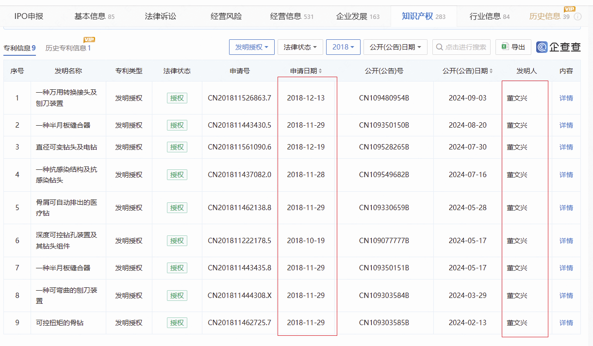 另外,長春圣博瑪于2017年5月18日申請、2018年12月獲授權的實用新型專利“一種工字扣臂微板裝置”,以及2017年5月18日申請、2018年10月獲授權的實用新型專利“一種T字扣臂微板裝置”“一種交叉力矩支撐雙釘裝置”實用新型專利,董文興也是發明人之一。從上述信息來看,董文興在長春圣博瑪任職的最后一刻,還在為該企業的發明專利和實用新型專利的申請貢獻力量。