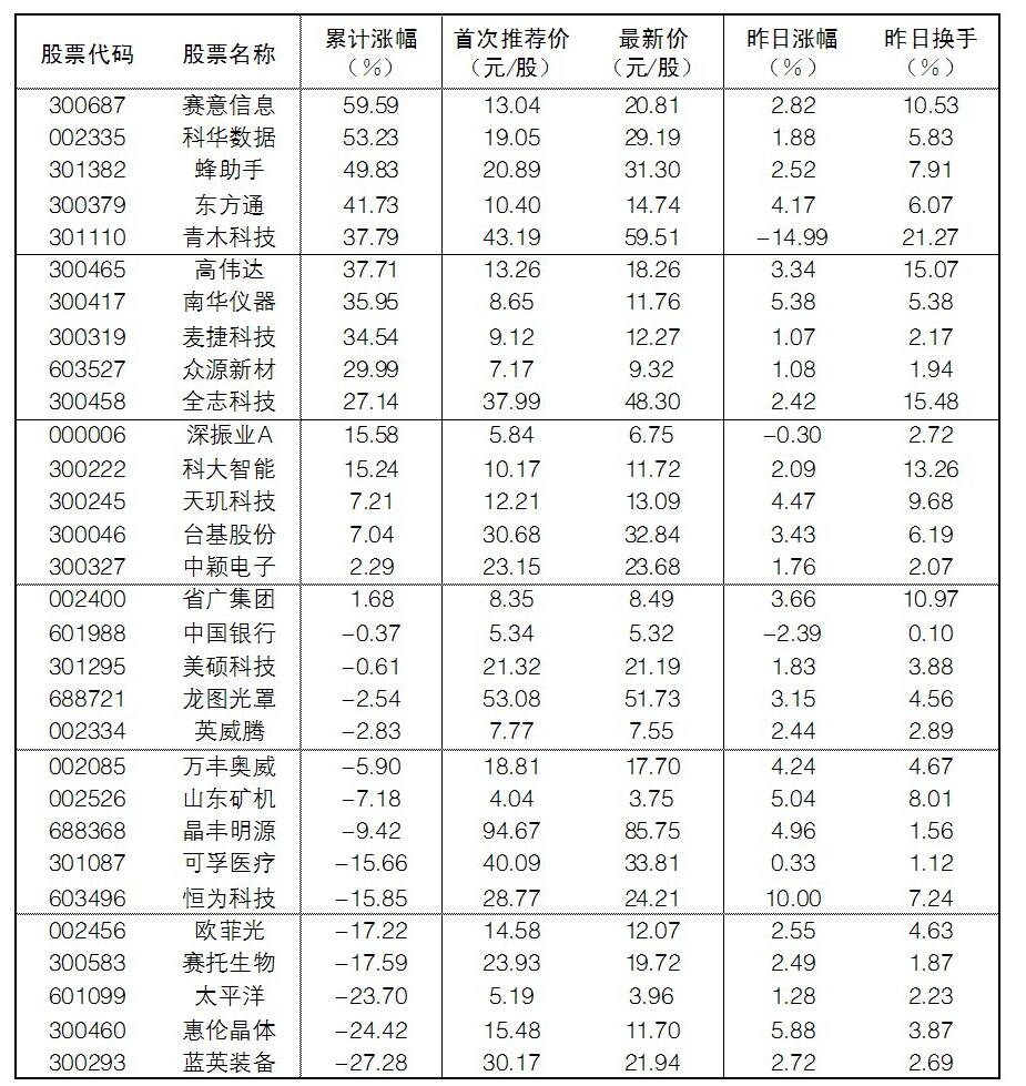 30成份股5日漲幅前五位的是恒為科技、惠倫晶體、南華儀器、山東礦機、晶豐明源,漲幅分別為10%、5.88%、5.38%、5.04%、4.96%;跌幅方面,青木科技、中國銀行、深振業A跌幅居前。