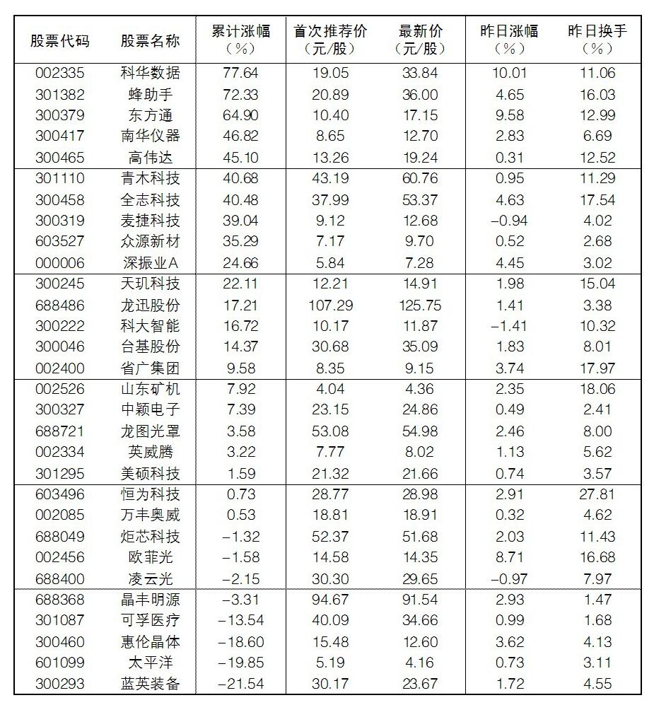 30成份股10日漲幅前五位的是科華數(shù)據(jù)、東方通、歐菲光、蜂助手、全志科技,漲幅分別為10.01%、9.58%、8.71%、4.65%、4.63%;跌幅方面,科大智能、凌云光、麥捷科技跌幅居前。