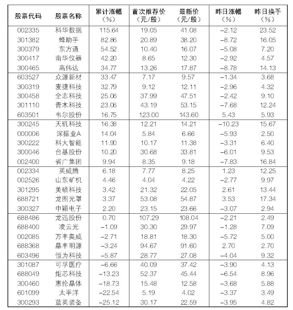30成份股18日漲幅前五位的是韋爾股份、龍圖光罩、晶豐明源、美碩科技、英威騰,漲幅分別為5.43%、3.53%、2.70%、2.61%、1.23%;跌幅方面,天璣科技、高偉達、蜂助手、省廣集團跌幅居前。
