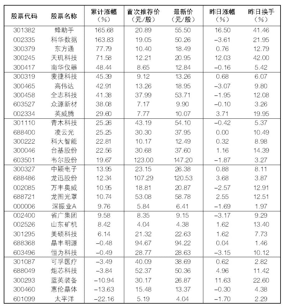 30成份股25日漲幅前五位的是蜂助手、天璣科技、藍英裝備、炬芯科技、英威騰,漲幅分別為16.50%、12.03%、11.63%、4.96%、3.71%;跌幅方面,科華數據、省廣集團、恒為科技跌幅居前。
