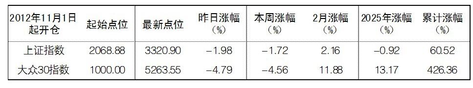 本報(bào)訊(記者 湯曉飛)本周,大盤呈現(xiàn)沖高回落的走勢(shì),上證綜指下跌1.72%,深證成指下跌3.46%,大眾30指數(shù)下跌4.56%。2月份,大眾30指數(shù)上漲11.88%,跑贏同期上證綜指逾9個(gè)百分點(diǎn)。