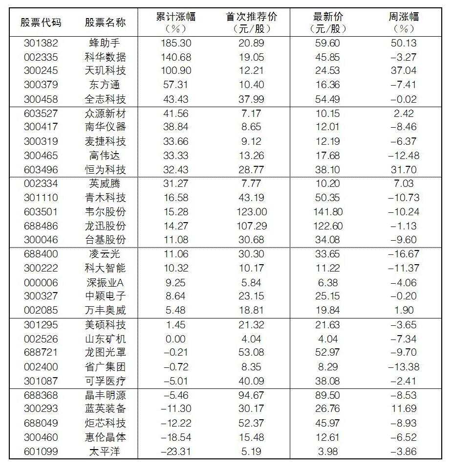 30成份股本周漲幅前五位的分別是蜂助手、天璣科技、恒為科技、藍(lán)英裝備、英威騰,漲幅分別為50.13%、37.04%、31.70%、11.69%、7.03%;跌幅方面,凌云光、省廣集團(tuán)、高偉達(dá)、科大智能跌幅居前。