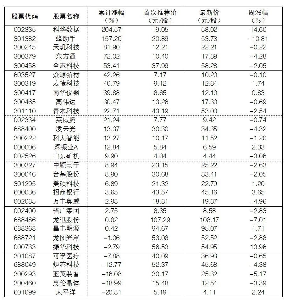 30成份股本周漲幅前五位的分別是科華數據、招商銀行、深振業A、太平洋、麥捷科技,漲幅分別為14.60%、3.65%、2.33%、2.24%、1.74%;跌幅方面,蜂助手、龍迅股份、藍英裝備、萬豐奧威、炬芯科技跌幅居前。
