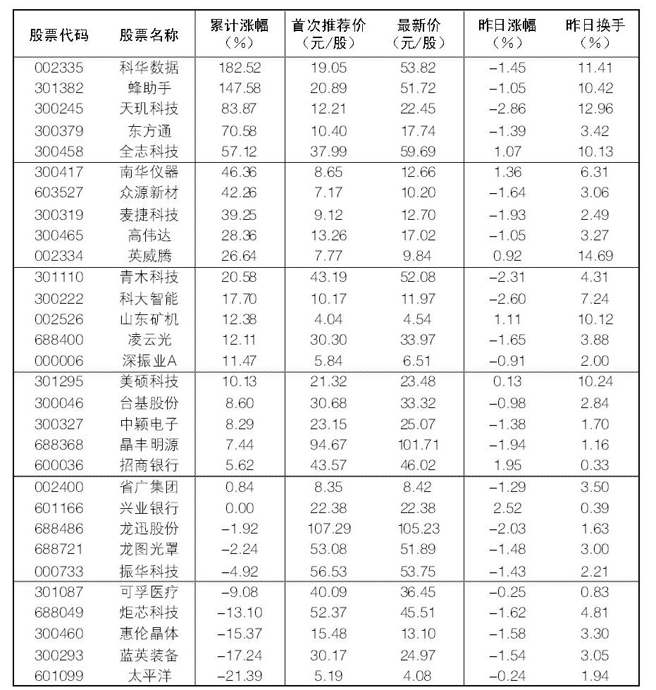 30成份股19日漲幅前五位的分別是招商銀行、南華儀器、山東礦機、全志科技、英威騰,漲幅分別為1.95%、1.36%、1.11%、1.07%、0.92%;跌幅方面,天璣科技、科大智能、青木科技、龍迅股份跌幅居前。