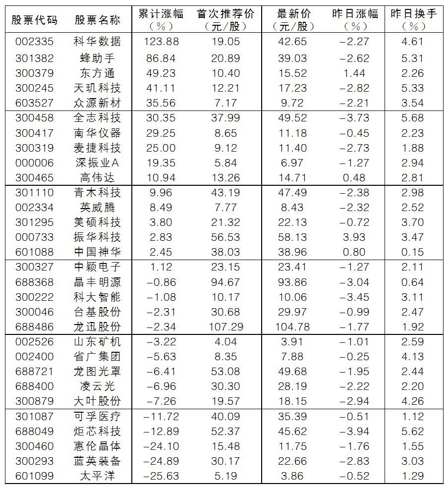 30成份股昨日逆市上漲的分別是振華科技、東方通、中國神華、高偉達,漲幅分別為3.93%、1.44%、0.80%、0.48%;跌幅方面,炬芯科技、全志科技、科大智能、晶豐明源跌幅居前。