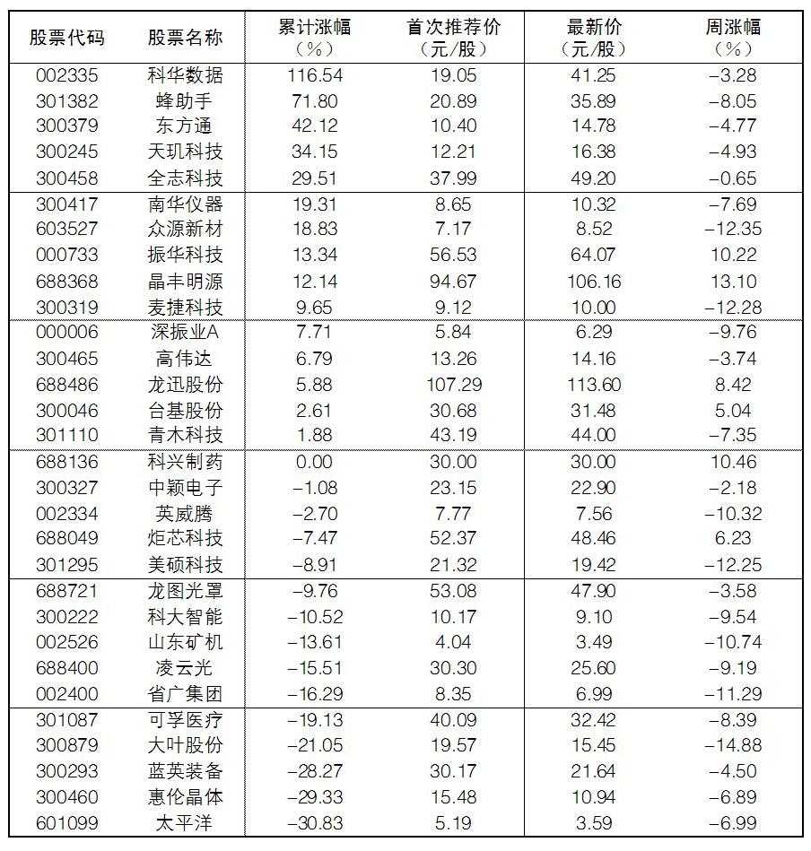 30成份股本周漲幅前五位的分別是晶豐明源、振華科技、龍迅股份、炬芯科技、臺基股份,漲幅分別為13.10%、10.22%、8.42%、6.23%、5.04%;跌幅方面,大葉股份、眾源新材、麥捷科技、美碩科技、省廣集團(tuán)跌幅居前。
