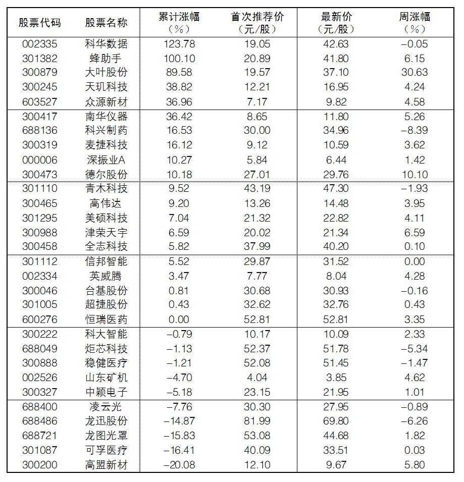 30成份股本周漲幅前五位的分別是大葉股份、德爾股份、津榮天宇、蜂助手、高盟新材,漲幅分別為30.63%、10.10%、6.59%、6.15%、5.80%。