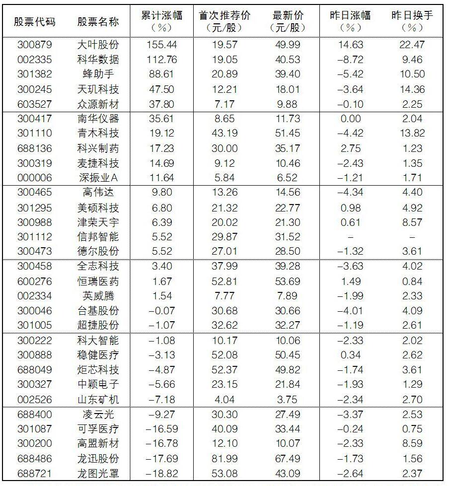 30成份股15日漲幅前五位的分別是大葉股份、科興制藥、恒瑞醫藥、美碩科技、津榮天宇,漲幅分別為14.63%、2.75%、1.49%、0.98%、0.61%;跌幅方面,科華數據、蜂助手、青木科技、高偉達等跌幅居前。