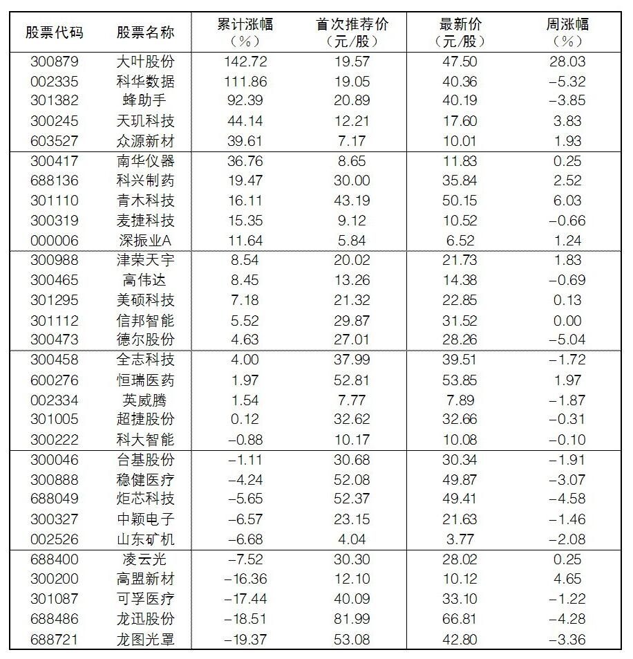 30成份股本周漲幅前五位的分別是大葉股份、青木科技、高盟新材、天璣科技、科興制藥,漲幅分別為28.03%、6.03%、4.65%、3.83%、2.52%;跌幅方面,科華數據、德爾股份、炬芯科技等跌幅居前。