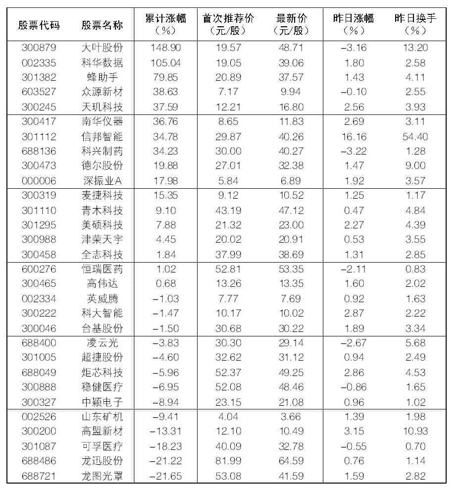 30成份股26日漲幅前五位的是科興制藥、德爾股份、信邦智能、凌云光、大葉股份,漲幅分別為16.10%、12.92%、9.96%、6.85%和5.89%;跌幅方面,高偉達、蜂助手、天璣科技、青木科技等跌幅居前。