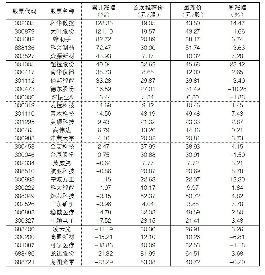 30成份股本周漲幅前五位的分別是超捷股份、科華數據、山東礦機、青木科技、眾源新材,漲幅分別為28.42%、14.47%、7.78%、7.43%和7.28%;跌幅方面,德爾股份、高盟新材、科興制藥、信邦智能等跌幅居前。