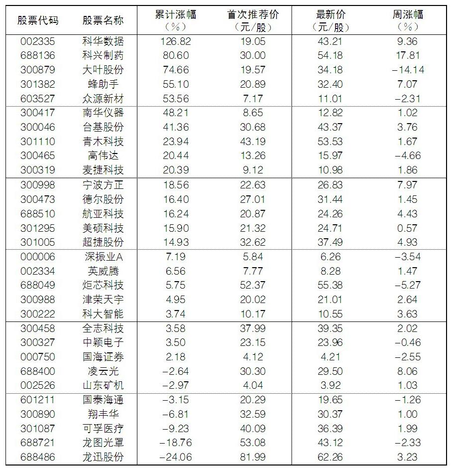 大眾30指數成份股中,本周漲幅前五位的是科興制藥、科華數據、凌云光、寧波方正、蜂助手,漲幅分別為17.81%、9.36%、8.06%、7.97%、7.07%;跌幅榜上,大葉股份、炬芯科技、高偉達、深振業A等跌幅居前。