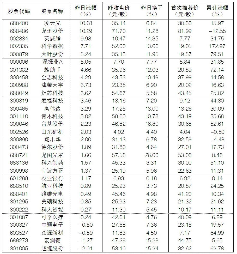 大眾30指數成份股中,18日漲幅前五位的分別是凌云光、龍迅股份、英威騰、科華數據、大葉股份,漲幅分別為10.68%、10.29%、9.98%、7.71%、5.24%;跌幅方面,超捷股份、麥瀾德、眾源新材等跌幅居前。