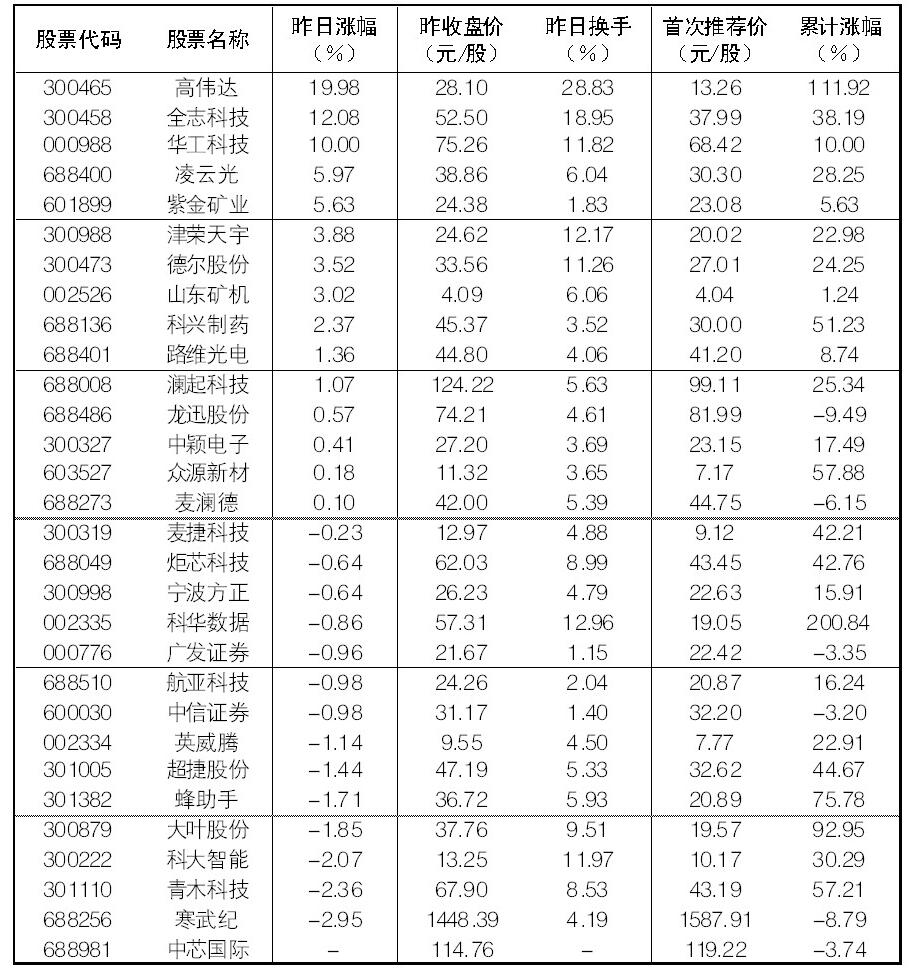 大眾30指數成份股中,1日漲幅前五位的分別是高偉達、全志科技、華工科技、凌云光、紫金礦業,漲幅分別為19.98%、12.08%、10.00%、5.97%、5.63%;跌幅方面,寒武紀、青木科技、科大智能、大葉股份等跌幅居前。