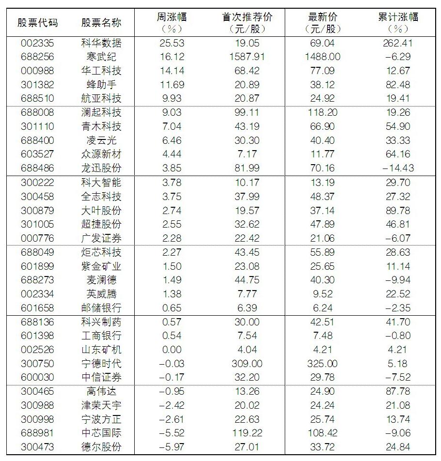 大眾30指數成份股中,本周漲幅前五位的分別是科華數據、寒武紀、華工科技、蜂助手、航亞科技,漲幅分別為25.53%、16.12%、14.14%、11.69%、9.93%;跌幅榜上,德爾股份、中芯國際、寧波方正、津榮天宇等跌幅居前。