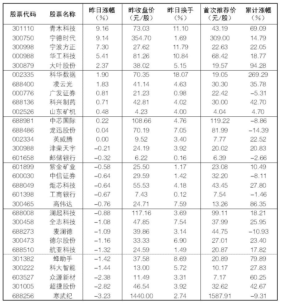 大眾30指數成份股中,15日漲幅前五位的分別是青木科技、寧德時代、寧波方正、華工科技、大葉股份,漲幅分別為9.16%、9.14%、7.30%、5.41%、2.37%;跌幅方面,寒武紀、超捷股份、眾源新材、科大智能等跌幅居前。