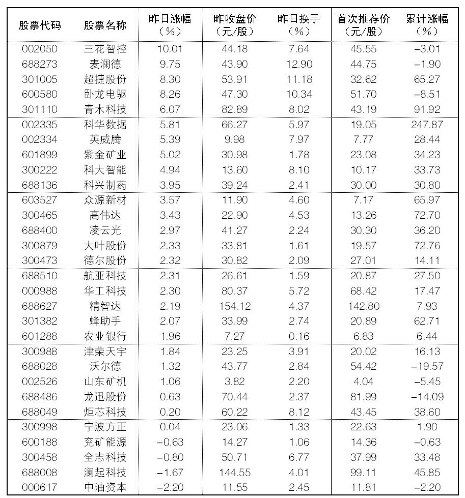 大眾30指數成份股中,15日漲幅前五位的分別是三花智控、麥瀾德、超捷股份、臥龍電驅、青木科技,漲幅分別為10.01%、9.75%、8.30%、8.26%、6.07%;跌幅榜上,中油資本、瀾起科技、全志科技等跌幅居前。