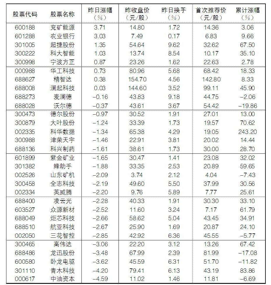 大眾30指數成份股中,16日漲幅前五位的分別是兗礦能源、農業銀行、超捷股份、科大智能、寧波方正,漲幅分別為3.71%、3.03%、1.35%、1.03%、0.87%;跌幅榜上,中油資本、青木科技、臥龍電驅、龍迅股份等跌幅居前。