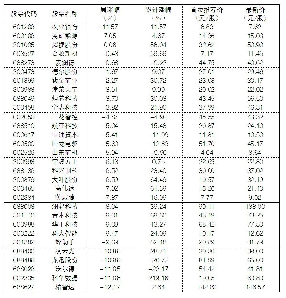 大眾30指數(shù)成份股中,本周股價(jià)逆市上漲的是農(nóng)業(yè)銀行、兗礦能源、超捷股份,漲幅分別為11.57%、7.05%、0.06%;跌幅榜上,精智達(dá)、科華數(shù)據(jù)、沃爾德、龍迅股份等跌幅居前。
