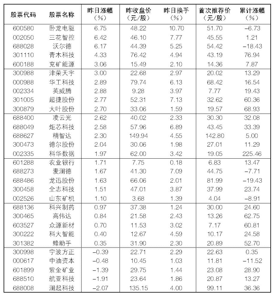 大眾30指數(shù)成份股中,20日漲幅前五位的分別是臥龍電驅(qū)、三花智控、沃爾德、青木科技、兗礦能源,漲幅分別為6.75%、6.42%、6.17%、4.33%、3.06%;跌幅榜上,瀾起科技、航亞科技、紫金礦業(yè)等跌幅居前。