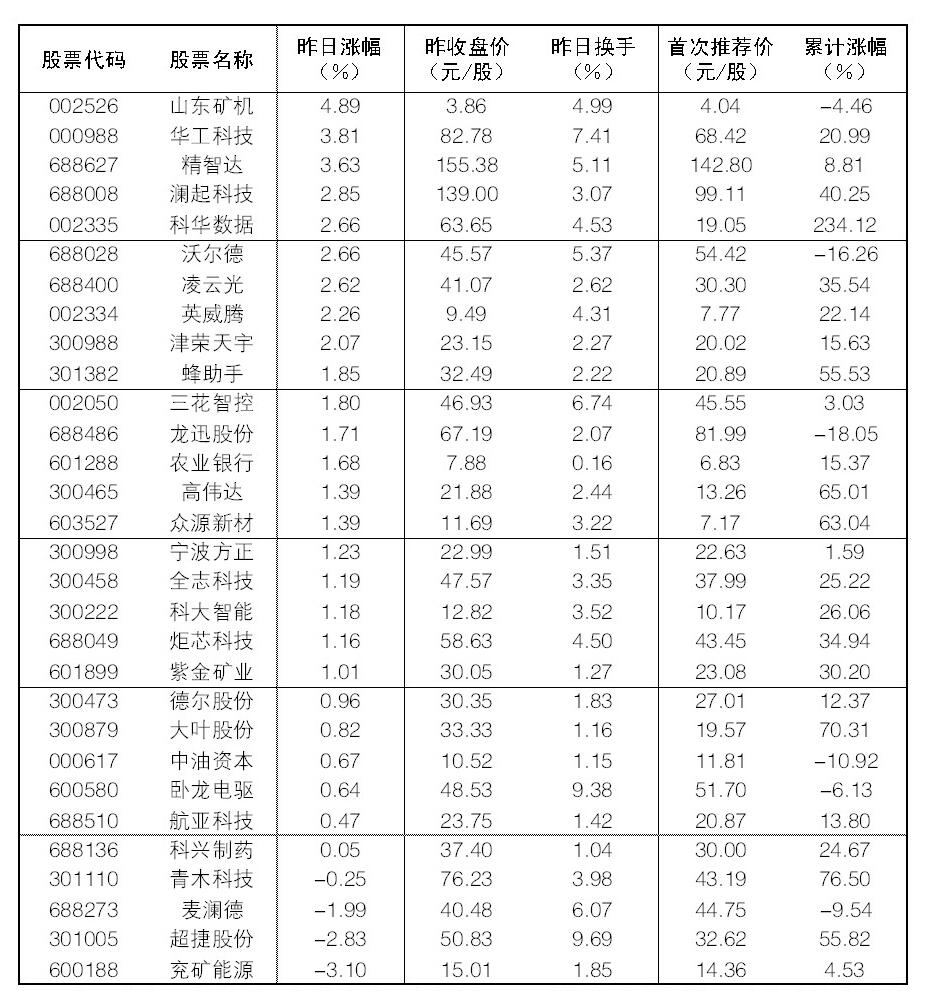 大眾30指數(shù)成份股中,21日漲幅前五位的分別是山東礦機(jī)、華工科技、精智達(dá)、瀾起科技、科華數(shù)據(jù),漲幅分別為4.89%、3.81%、3.63%、2.85%和2.66%;跌幅榜上,兗礦能源、超捷股份、麥瀾德等跌幅居前。