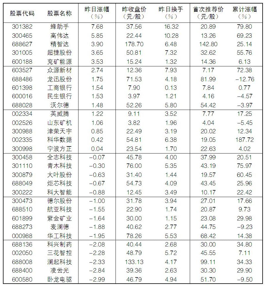 大眾30指數(shù)成份股中,3日漲幅前五位的分別是蜂助手、高偉達(dá)、精智達(dá)、超捷股份、兗礦能源,漲幅分別為7.68%、5.85%、3.90%、3.65%、3.53%;跌幅榜上,臥龍電驅(qū)、凌云光、瀾起科技等跌幅居前。