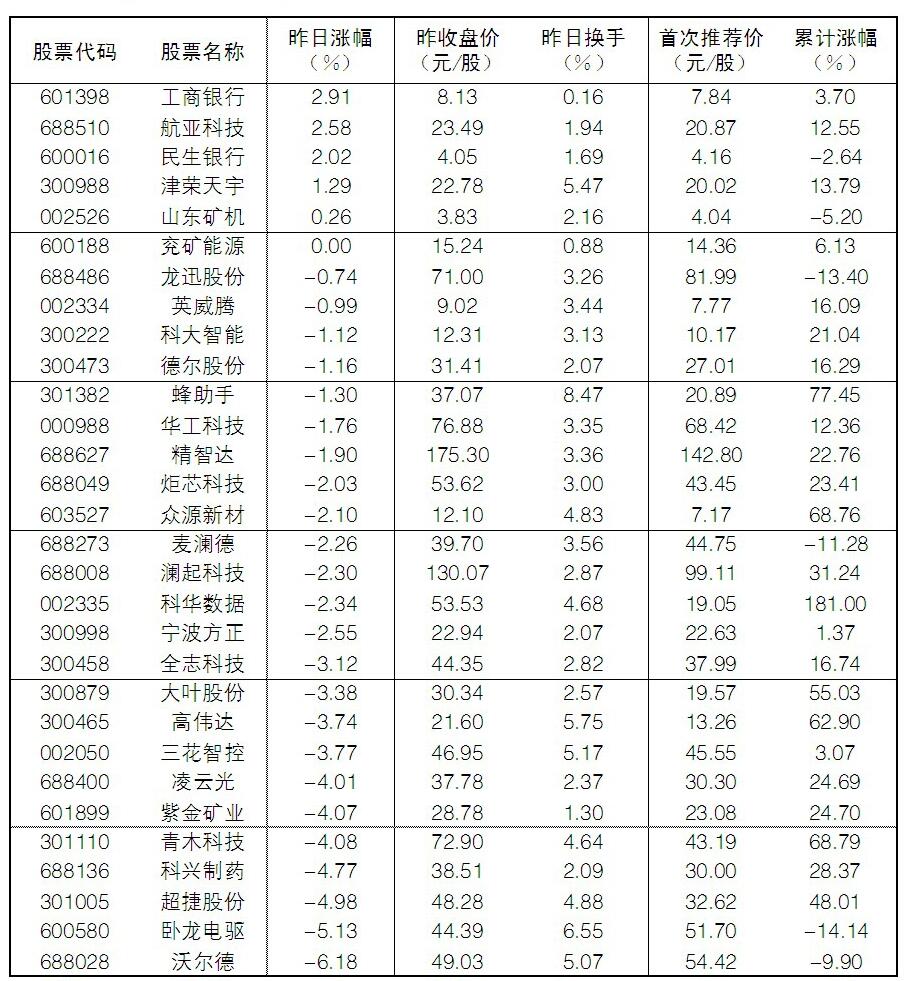 大眾30指數成份股中,4日漲幅前五位的分別是工商銀行、航亞科技、民生銀行、津榮天宇、山東礦機,漲幅分別為2.91%、2.58%、2.02%、1.29%、0.26%;跌幅榜上,沃爾德、臥龍電驅、超捷股份、科興制藥等跌幅居前。