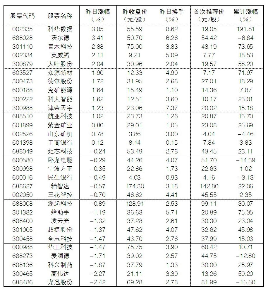 大眾30指數成份股中,5日漲幅前五位的分別是科華數據、沃爾德、青木科技、英威騰、大葉股份,漲幅分別為3.85%、3.41%、2.88%、2.11%、2.04%;跌幅榜上,龍迅股份、高偉達、科興制藥、麥瀾德等跌幅居前。