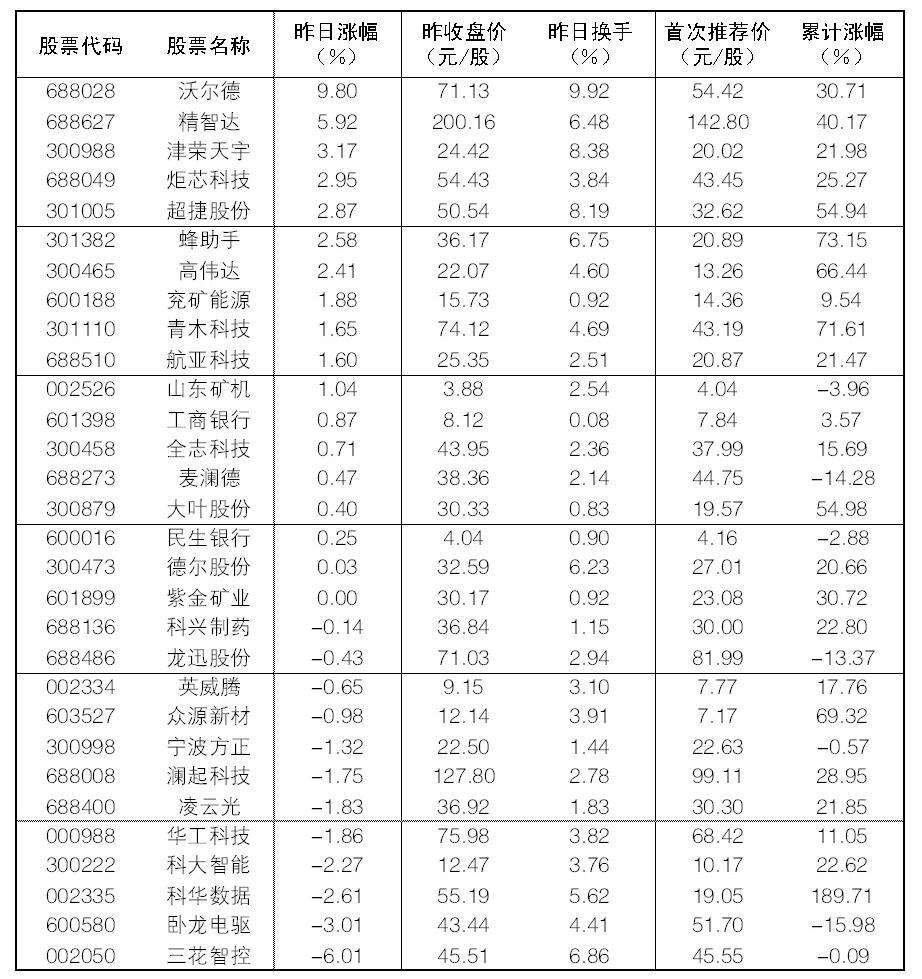 大眾30指數成份股中,10日漲幅前五位的分別是沃爾德、精智達、津榮天宇、炬芯科技、超捷股份,漲幅分別為9.80%、5.92%、3.17%、2.95%、2.87%;跌幅榜上,三花智控、臥龍電驅、科華數據、科大智能等跌幅居前。