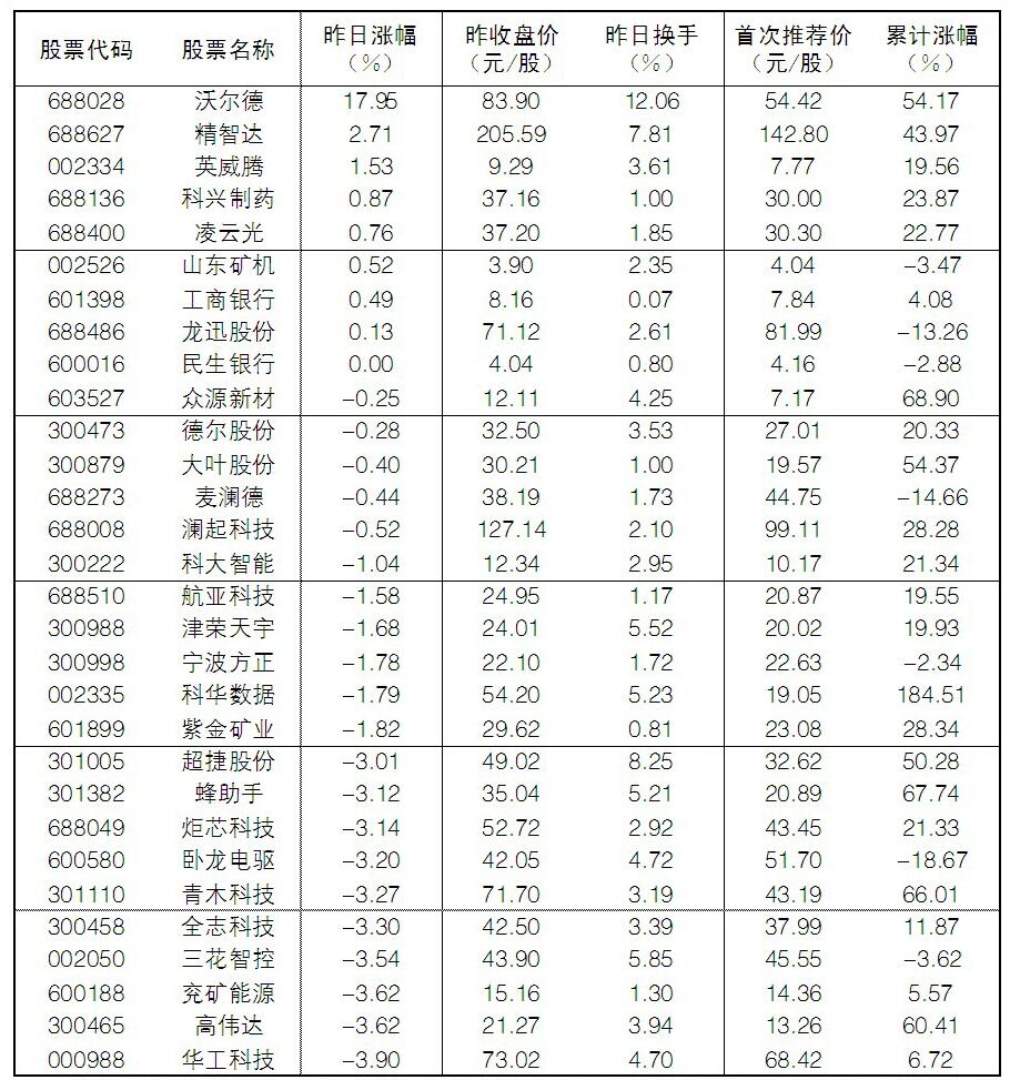 大眾30指數成份股中,11日漲幅前五位的分別是沃爾德、精智達、英威騰、科興制藥、凌云光,漲幅分別為17.95%、2.71%、1.53%、0.87%、0.76%;跌幅榜上,華工科技、高偉達、兗礦能源、三花智控、全志科技等跌幅居前。