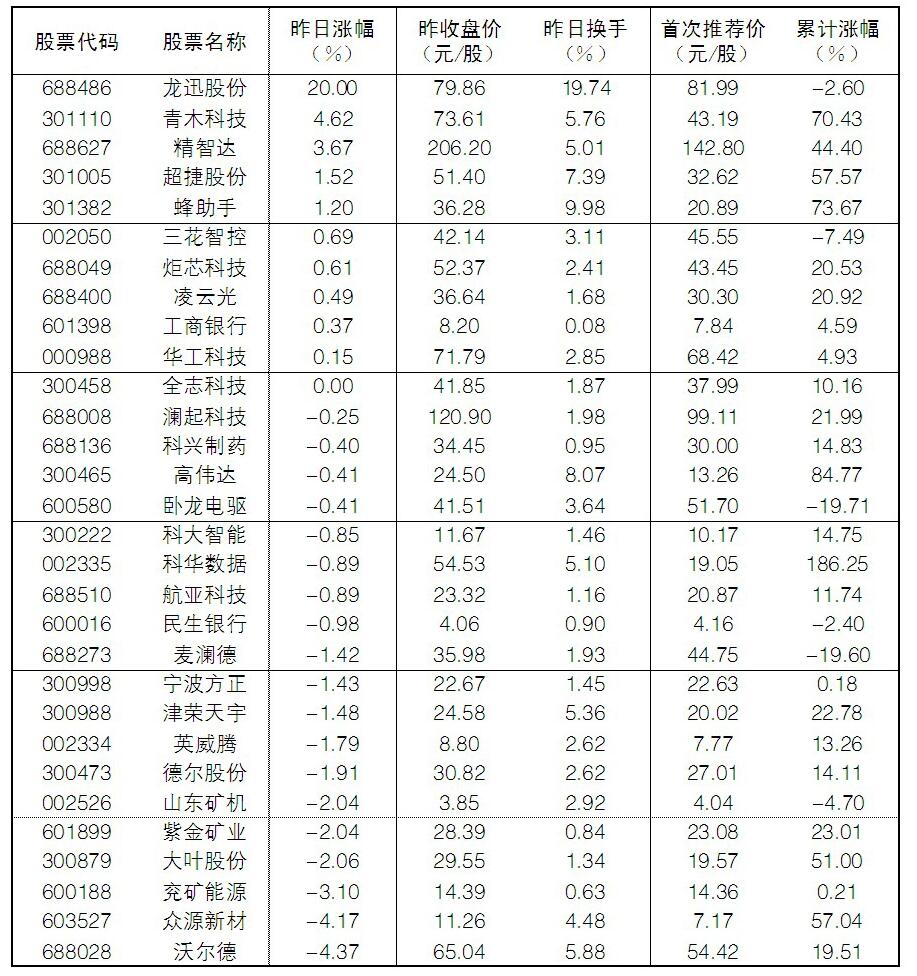 大眾30指數(shù)成份股中,18日漲幅前五位的分別是龍迅股份、青木科技、精智達、超捷股份、蜂助手,漲幅分別為20.00%、4.62%、3.67%、1.52%、1.20%;跌幅榜上,沃爾德、眾源新材、兗礦能源、大葉股份等跌幅居前。