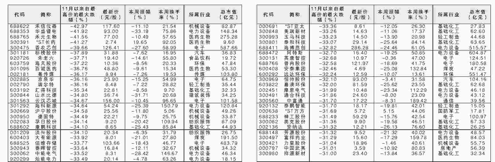 本周市場出現調整,周五個別此前跌幅較大的個股出現反彈,比如禾信儀器股價出現漲停。根據Wind數據統計,截至11月21日,51股股價較11月最高價回撤超過31%。市場人士表示,超跌后的反彈仍需要關注基本面、消息面上的變化。