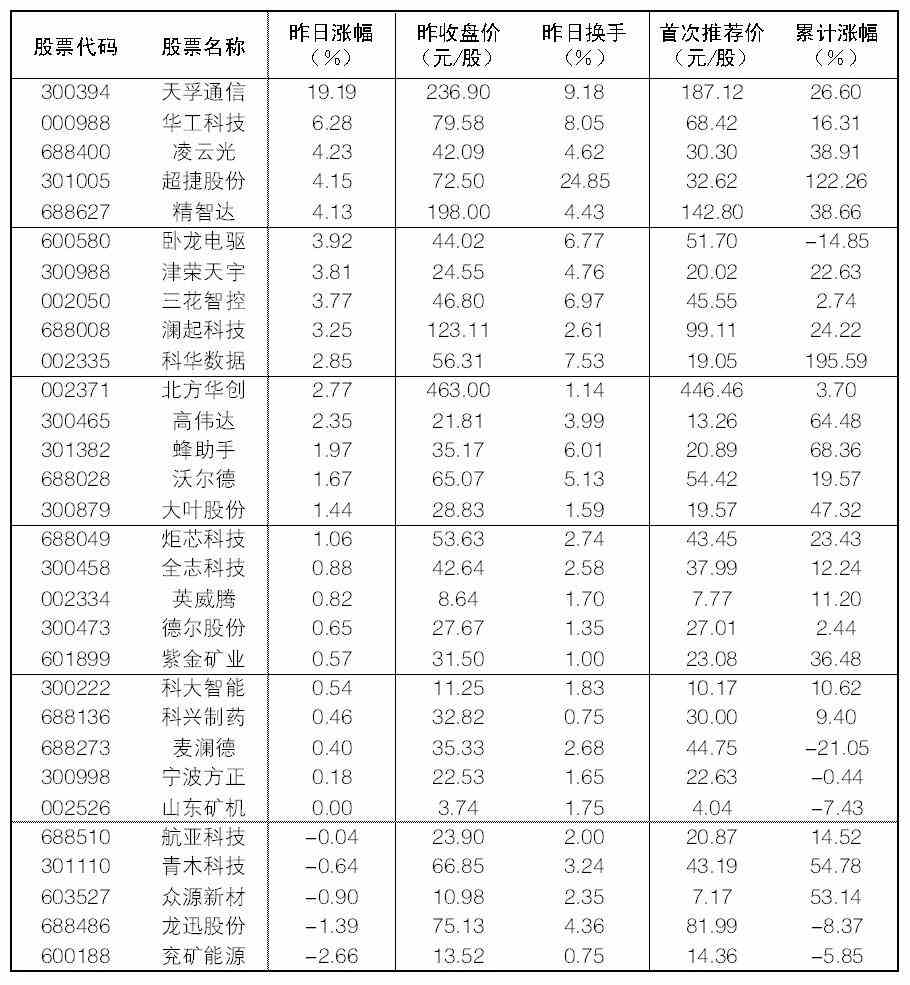 大眾30指數成份股中,8日漲幅前五位的分別是天孚通信、華工科技、凌云光、超捷股份、精智達,漲幅分別為19.19%、6.28%、4.23%、4.15%和4.13%;跌幅榜上,兗礦能源、龍迅股份、眾源新材、青木科技等跌幅居前。