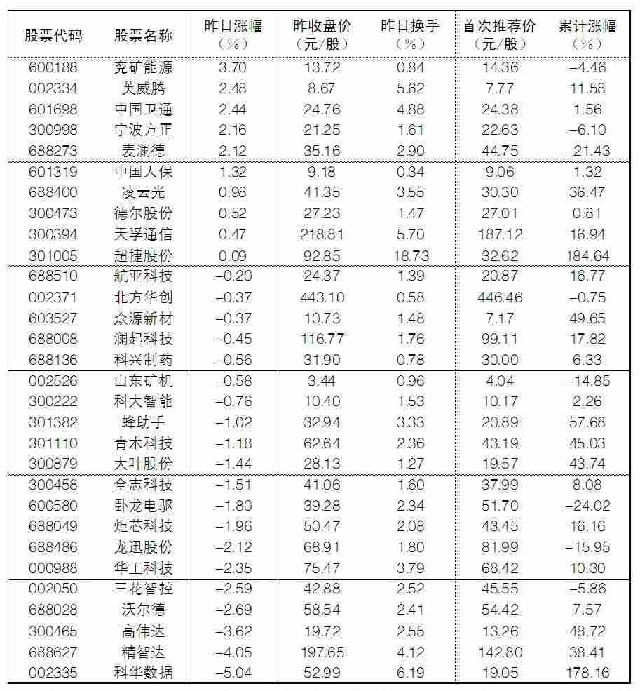 大眾30指數(shù)成份股中,18日漲幅前五位的分別是兗礦能源、英威騰、中國衛(wèi)通、寧波方正、麥瀾德,漲幅分別為3.70%、2.48%、2.44%、2.16%、2.12%;跌幅榜上,科華數(shù)據(jù)、精智達(dá)、高偉達(dá)、沃爾德等跌幅居前。