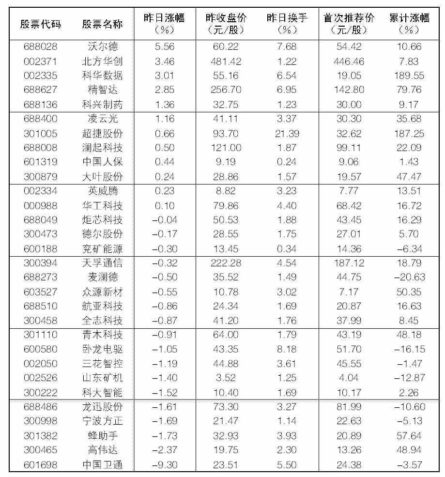 大眾30指數成份股中,23日漲幅前五位的分別是沃爾德、北方華創、科華數據、精智達、科興制藥,漲幅分別為5.56%、3.46%、3.01%、2.85%、1.36%;跌幅榜上,中國衛通、高偉達、蜂助手、寧波方正等跌幅居前。